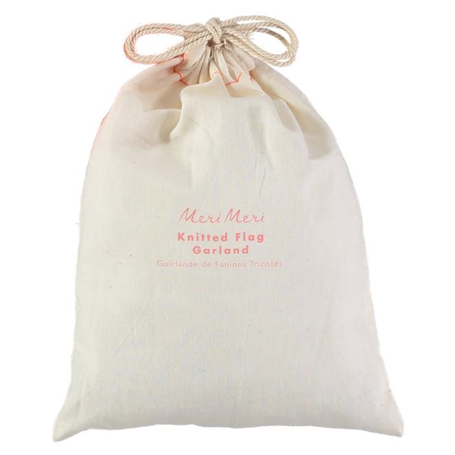 Beautifully decorate a wall, bookcase or bedpost with this gorgeous garland. Strung on sturdy cord, the knitted organic cotton flag pennants are in bright coral and natural shades. Comes with a handy drawstring bag for storage.